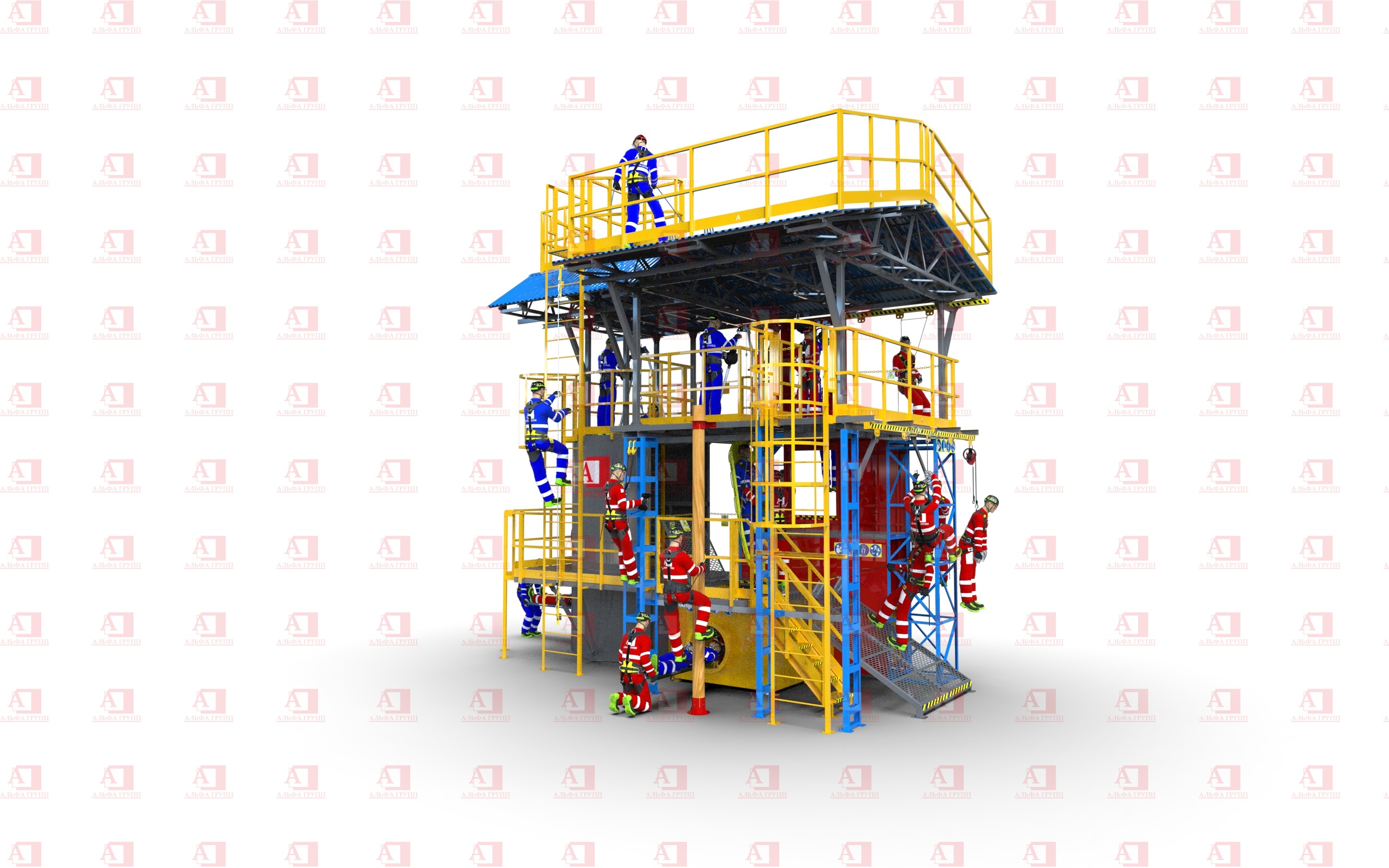Этажные уровни полигона «АЛЬПИНИСТ» выполнены из просечных листов стали с полимерным покрытием. Поверхности удобны в эксплуатации как в помещении, так и на улице. Поверхность не скользит, грязь не задерживается, легко поддается бесконтактной мойке.