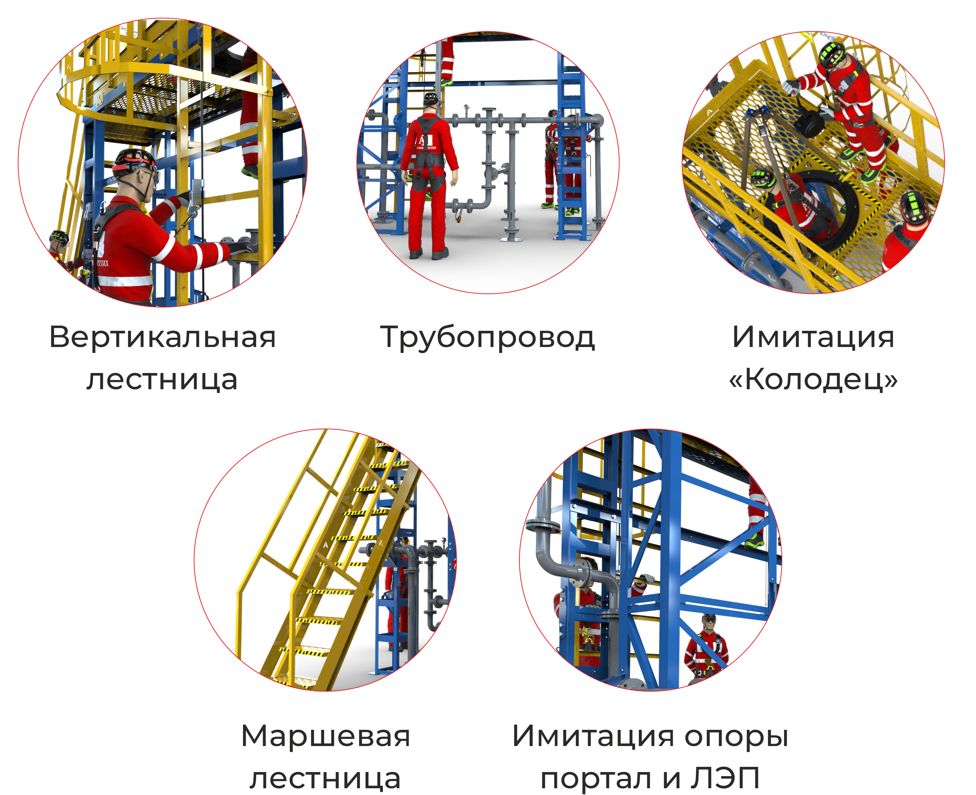 Ключевым преимуществом можно отнести модульность и изменяемость элементов конструкций учебных элементов. Основные колонны учебного комплекса имитируют основные элементы: опоры, порталы, башни, мачты, столбы. Опционально элементы возможно заменить на другие производственные элементы: эстакады, радиорелейные, радиотелефонные мачты, опоры для оборудования связи, кабельные эстакады, дымовые трубы и опоры дымоходов, опоры вл, подкрановые конструкции, фермы и т.д.